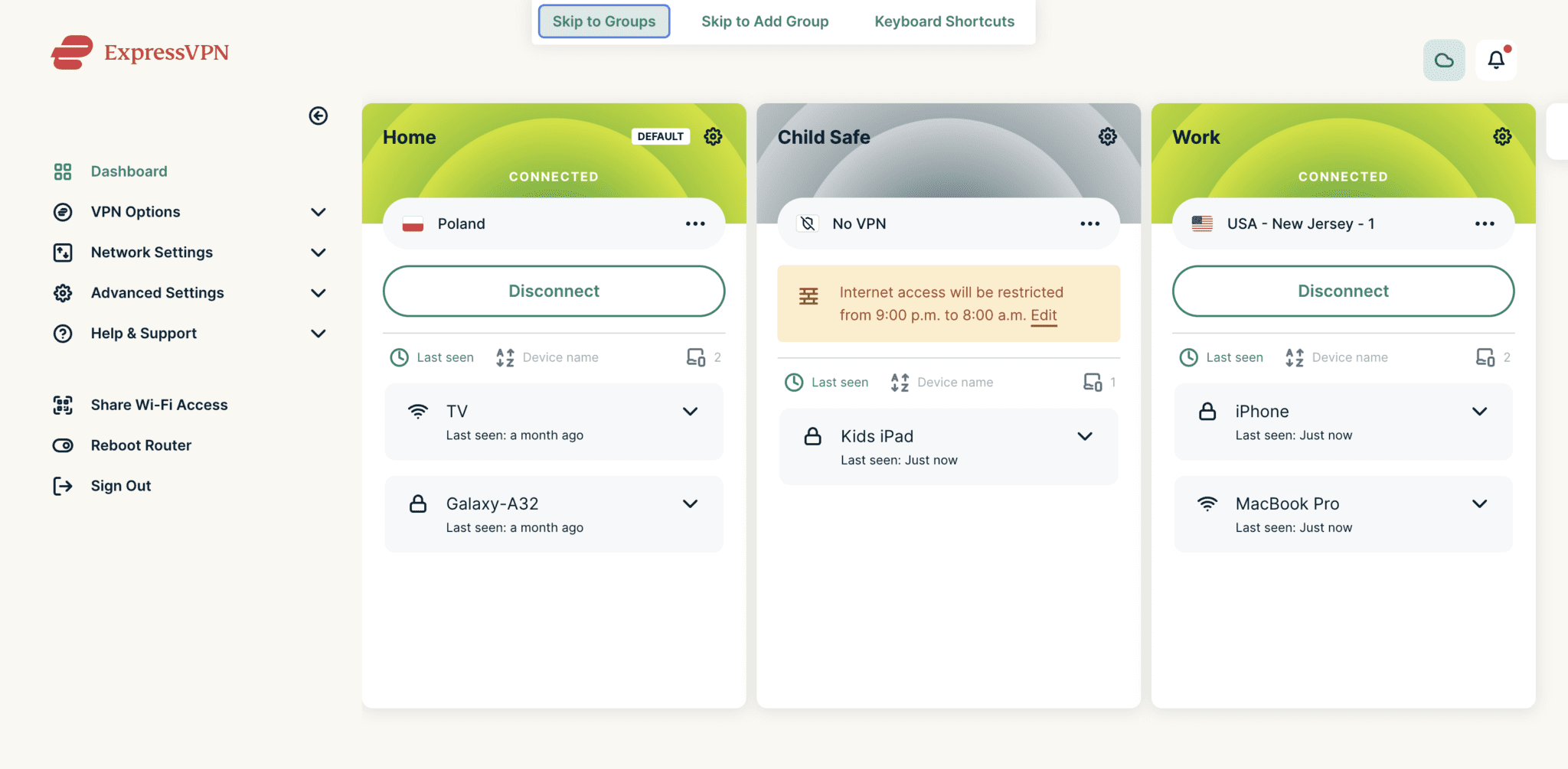 The best practice for accessible keyboard navigation is to offer skip links at the top of the page, allowing the user to skip to certain parts of the page right away. On the Aircove dashboard, skip links can take users directly to the device groups and device lists.