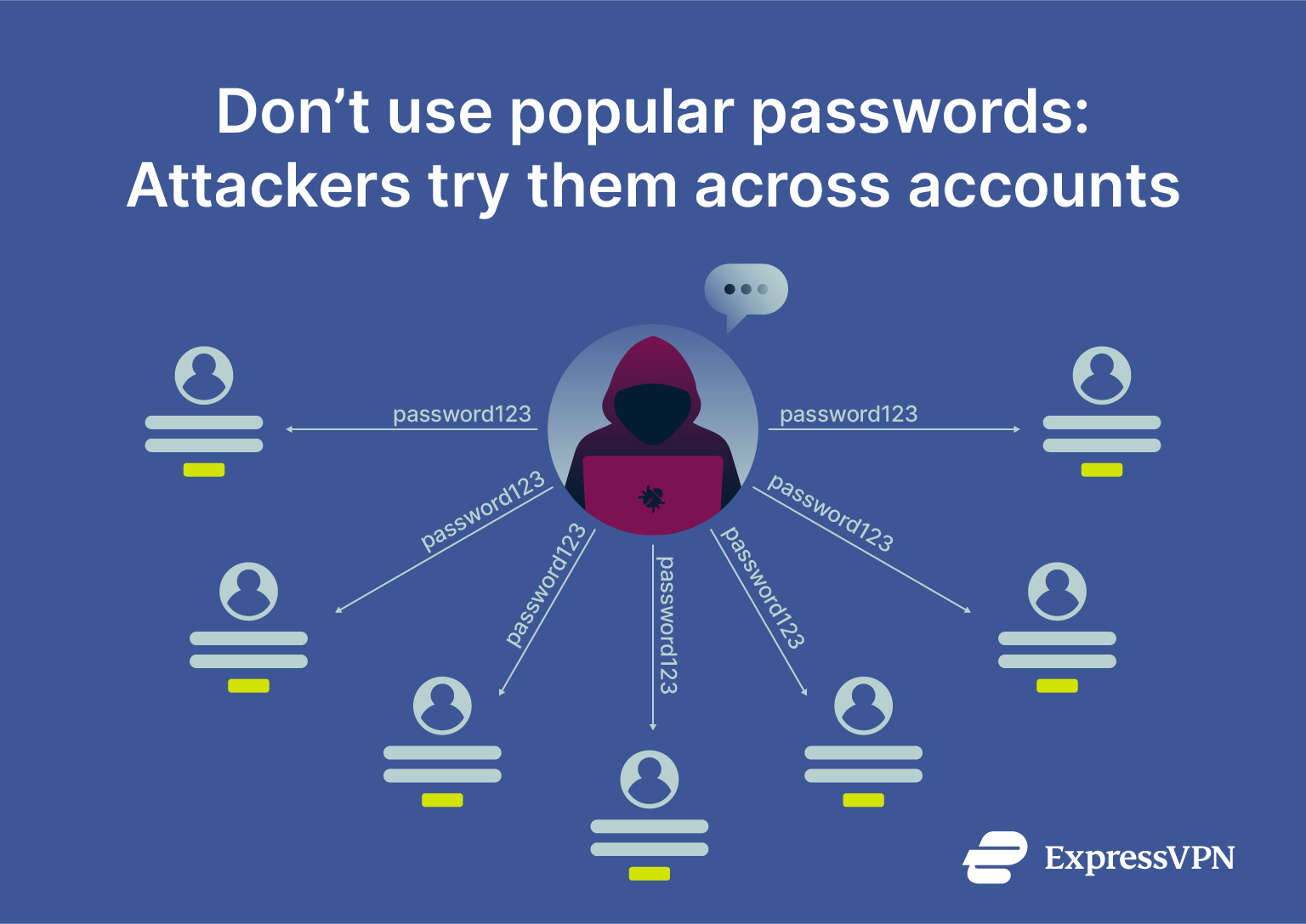 Password spraying is a method where cybercriminals try common passwords, like “password123” or “Welcome1,” on many accounts at once. Instead of guessing one person’s password over and over, they test one common password across a large number of users to avoid detection.A diagram showing how businesses can give different teams access to different sets of credentials.The best way to protect yourself from this attack is to not use common passwords.