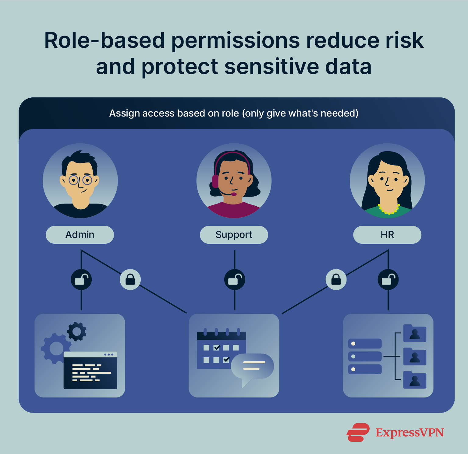 When managing large teams, start by identifying who needs the highest level of access. Next, implement role-based permissions to control visibility, only giving team members access to what they actually need. For instance, your customer support team might need access to help desk tools but not internal HR platforms. This approach reduces risk and keeps sensitive information accessible only to the right people.A diagram showing how businesses can give different teams access to different sets of credentials.