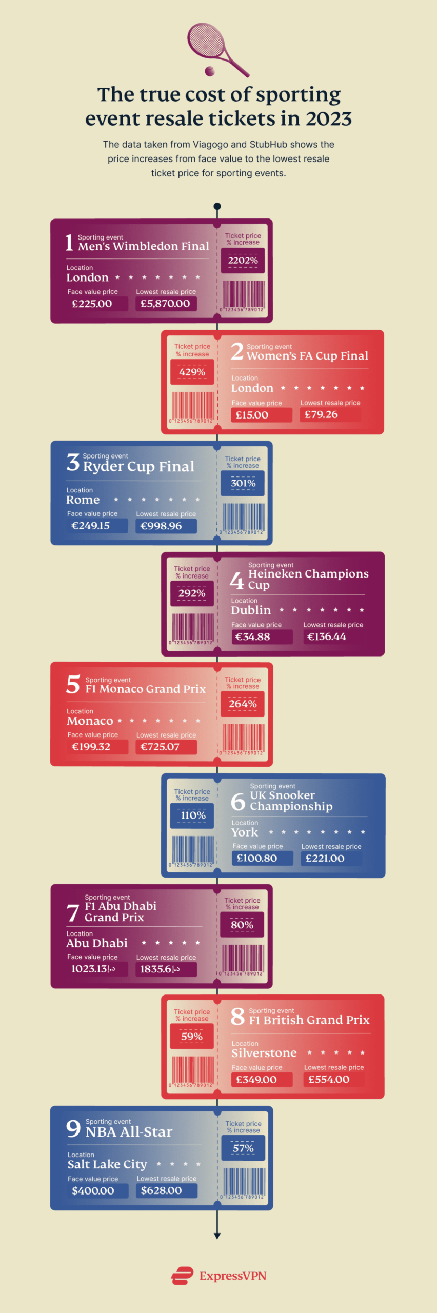 To shed light on the issue, ExpressVPN conducted an analysis of ticket prices for some of this year’s biggest events in three categories: sports, musicians, and comedians. We looked at the original ticket prices and compared them to their resale prices on Ticketmaster, Viagogo, and StubHub to find out which have the highest percentage markups. In fact, we focused on the lowest resale prices we found, but they were still outrageously high.