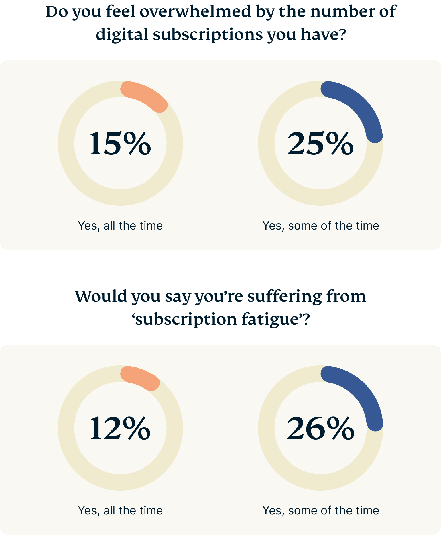 However, it’s not just the cost or the devices we use that contribute to subscription fatigue. It’s the mental load that comes with managing so many services. According to our survey, 40% of respondents admitted to feeling overwhelmed by the number of digital subscriptions they manage.