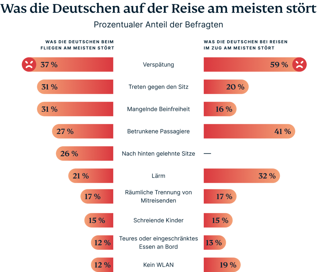 Das Reisen mit der Bahn nimmt bei den Deutschen immer mehr Fahrt auf. Doch auch hier zeichnet sich Unmut ab, der im Vergleich zum Fliegen etwas anderer Natur ist: Schlechte Laune durch Verspätung nimmt bei 59 % der Befragten einen noch höheren Stellenwert ein. Der Raumkomfort scheint im Zug weniger ein Problem zu sein, denn hier störten sich nur 20 % beziehungsweise 16 % an tretenden Sitznachbarn und mangelnder Beinfreiheit. Auf der anderen Seite beklagten allerdings 41 % der deutschen Befragten betrunkene Passagiere und 31 % Lärm.