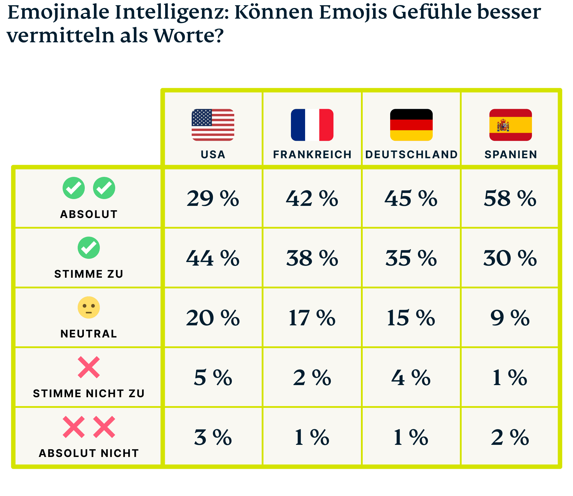 Fast drei Viertel (73 %) der Deutschen glauben, dass Emojis schlechte Nachrichten abmildern. Diese Meinung vertritt auch ein Großteil der Befragten in Frankreich und Spanien. Im Gegensatz dazu glauben 51 % der Amerikaner nicht, dass Emojis schlechte Nachrichten abmildern. Mehr als die Hälfte (52 %) der Amerikaner gibt jedoch an, dass sie Emojis auch schon genutzt haben, um ihre Gefühle zu verbergen. Bei den deutschen Befragten schlägt diese Zahl mit 70 % zu Buche.