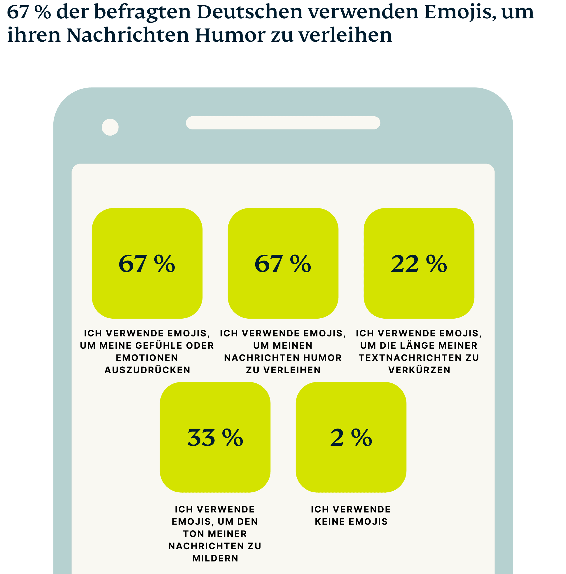 Auf die Frage, welche fünf Emojis sie am häufigsten verwenden, waren die Ergebnisse für die Befragten in Deutschland durchweg positiv. Das lachende und weinende Gesicht (😂) ist das am häufigsten verwendete Emoji. Darauf folgt das Herz (❤️) und dicht darauf das Kussgesicht (😘). Das lächelnde Gesicht mit Herzen (🥰) folgt an vierter Stelle, das Daumen-hoch-Emoji (👍) an fünfter. Weiterhin erwähnenswert sind das weinende Gesicht (😭), der Sich-vor-Lachen-auf-dem-Boden-wälzen-Emoji (🤣) und das verschwitzte Grinsegesicht (😅).