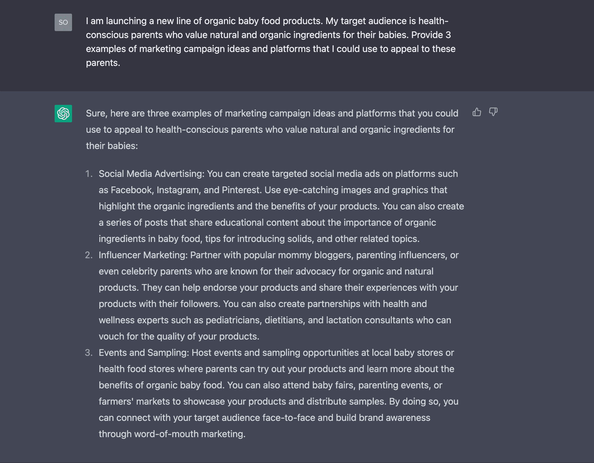 Eine Möglichkeit, neue Ideen zu kreieren, ist, sich in die Position Ihrer Zielgruppe zu versetzen. Wenn Sie beispielsweise auf der Suche nach Marketingideen für neue Produkte sind, könnten Sie ChatGPT bitten, wie ein potenzieller Kunde zu denken und Ihnen Einblicke dazu zu liefern, was dieser attraktiv fände.