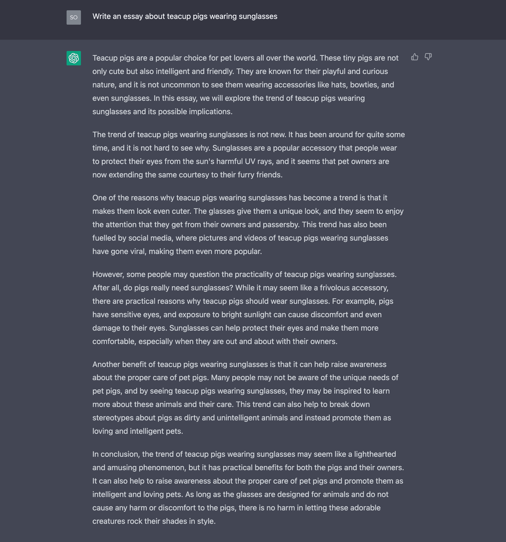 Wenn Sie ChatGPT beispielsweise bitten, „schreibe einen Aufsatz über Minischweine mit Sonnenbrillen“, wird die KI einen langweiligen, standardisierten Text verfassen, der Ihre Anforderungen nur geringfügig zufriedenstellen wird.