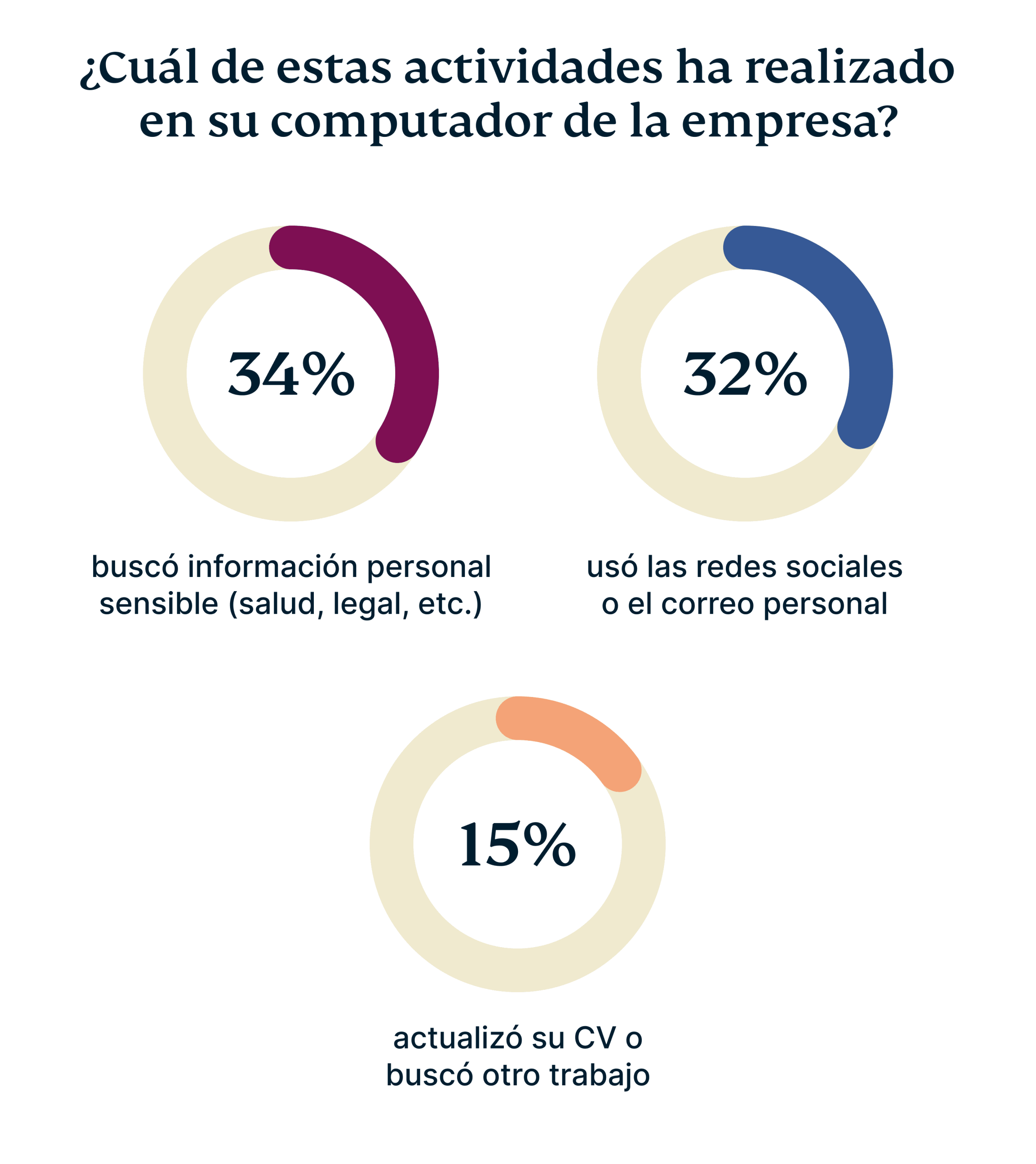 Parece que los nuevos empleados y empleadores afrontan una realidad inevitable: al tener un dispositivo con acceso a internet, nuestras vidas siguen siendo las mismas y para muchos resulta difícil encontrar esa disciplina que lleva a hacer ciertas búsquedas en tiempo laboral, y ciertas búsquedas en tiempo personal. En este nuevo mundo donde trabajar desde casa es habitual, las fronteras entre lo personal y lo profesional se difuminan. Esta situación no debería ser un problema si hay transparencia por parte de la empresa y compromiso por parte del empleado. Sin embargo, nuestra encuesta revela que muchos empleados sienten ansiedad y preocupación ante el aumento de la vigilancia por parte de sus jefes.