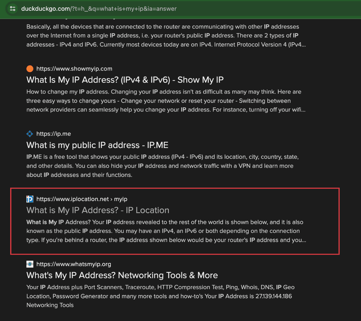 Non, DuckDuckGo ne masque pas votre adresse IP. En tant que moteur de recherche, DuckDuckGo ne trace pas et ne stocke pas vos informations personnelles, incluant votre adresse IP, lorsque vous l'utilisez pour faire des recherches sur le web. Mais les sites que vous visitez connaitrons quand même votre adresse IP. Si vous souhaitez masquer votre adresse IP, vous aurez besoin d'utiliser des outils comme les VPN ou le réseau Tor. DuckDuckGo offre un service .onion, qui offre des protections de la vie privée additionnelles lorsqu'on y accède via le navigateur Tor.