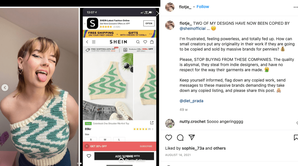 La plateforme Shein a également été critiquée pour l'apparente similarité de certains de ses produits avec des designs d’artistes indépendants et de petites entreprises. Des créateurs ont exprimé des préoccupations selon lesquelles leurs œuvres originales pourraient avoir inspiré des articles Shein, soulevant des débats sur la protection de la propriété intellectuelle dans la mode rapide.