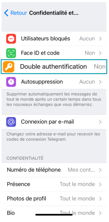 L’authentification à deux facteurs (2FA) (ou double authentification) ajoute un niveau de sécurité supplémentaire à votre compte Telegram. Même si une autre personne connaît votre mot de passe, elle ne sera pas en mesure de se connecter sans un second code.