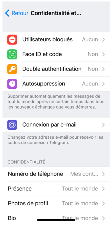 Telegram vous permet de contrôler qui peut consulter vos informations personnelles.