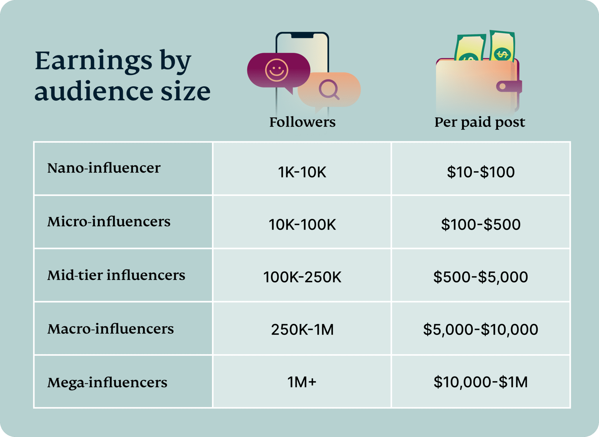 I micro-influencer si trovano in un punto favorevole: abbastanza grandi da avere influenza, ma abbastanza piccoli da mantenere una connessione personale con il loro pubblico. I marchi cercano attivamente i micro-influencer perché i loro tassi di coinvolgimento tendono ad essere più alti rispetto a quelli dei macro o mega influencer. Questi creatori in genere guadagnano tra i $100 e i $500 per post sponsorizzato.