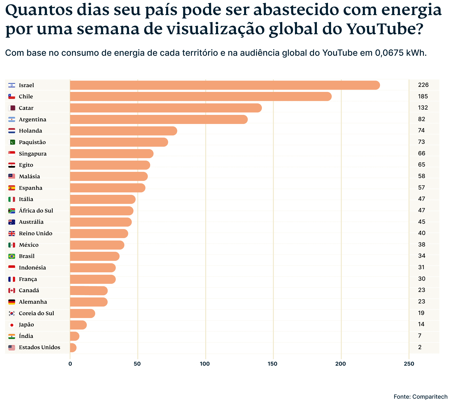 - Assistir globalmente ao YouTube gasta tanta energia que desligá-lo por uma semana poderia abastecer alguns países pequenos por um ano.