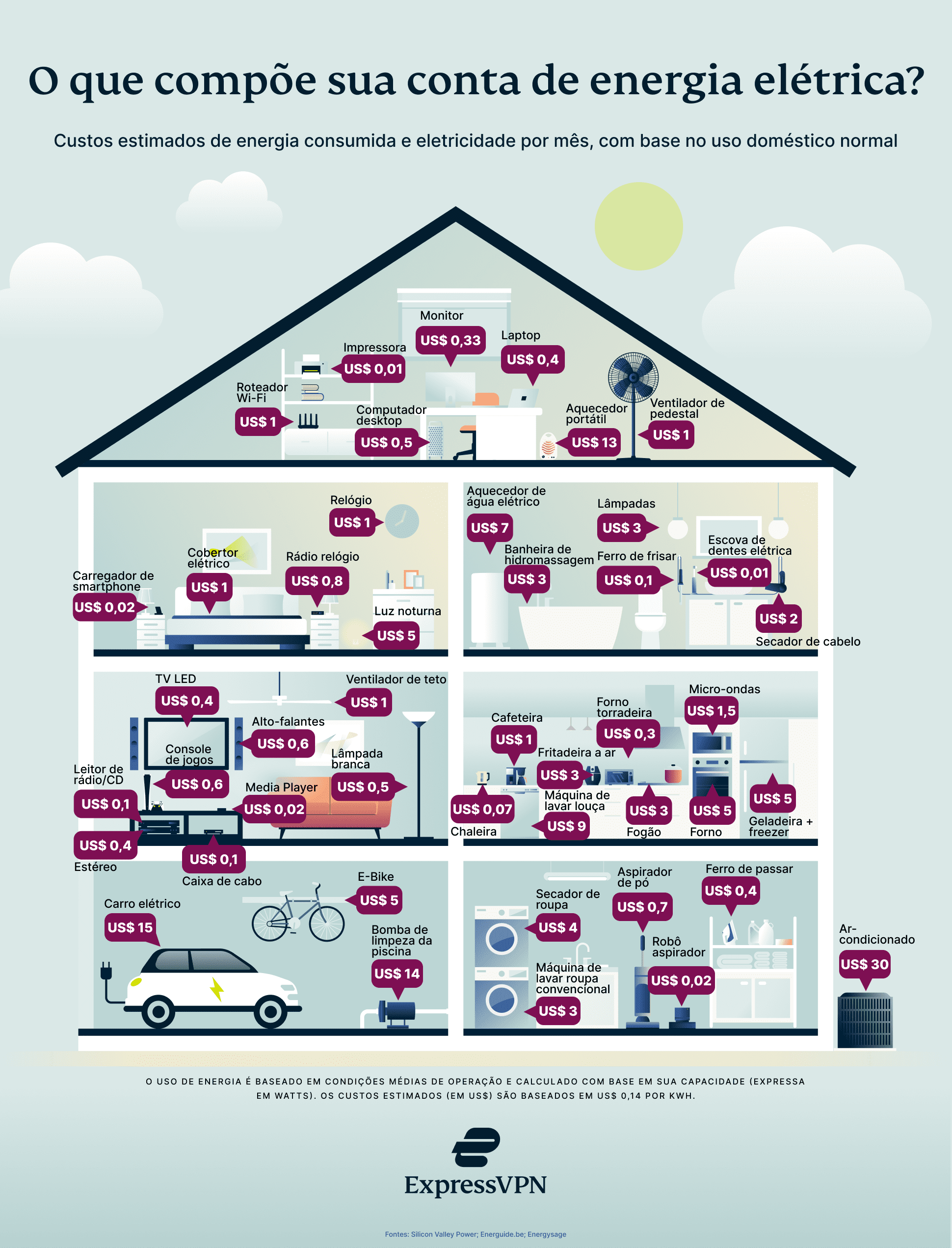 No infográfico abaixo, detalhamos o uso de energia de cada item em uma residência americana típica por mês, juntamente com o custo associado a ele: