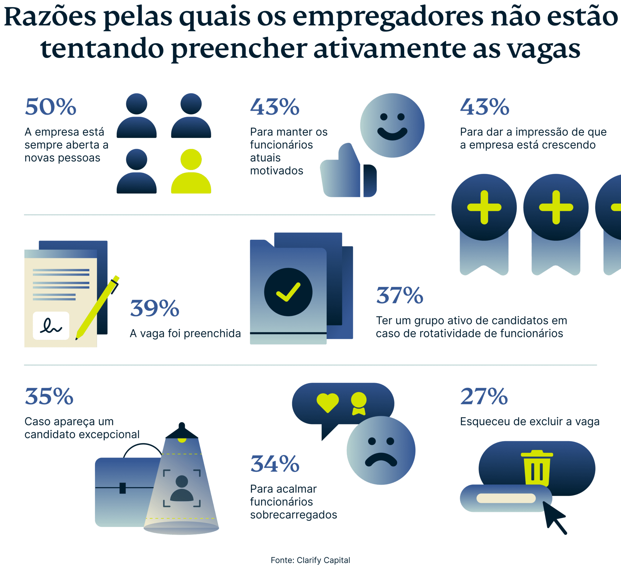 - Um estudo da Clarify Capital descobriu que, embora muitos empregadores mantenham empregos fantasmas apenas para o caso de um bom candidato se apresentar, 43% dos anunciantes de empregos fantasmas o fazem para dar a impressão de que a empresa está crescendo.