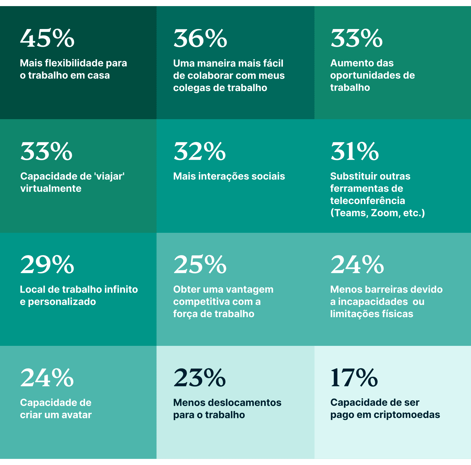 - Quem está interessado? 77% dos empregadores manifestaram interesse em ambientes de trabalho imersivos como o metaverso, em comparação com apenas 57% dos funcionários. (Ir para esta seção.)