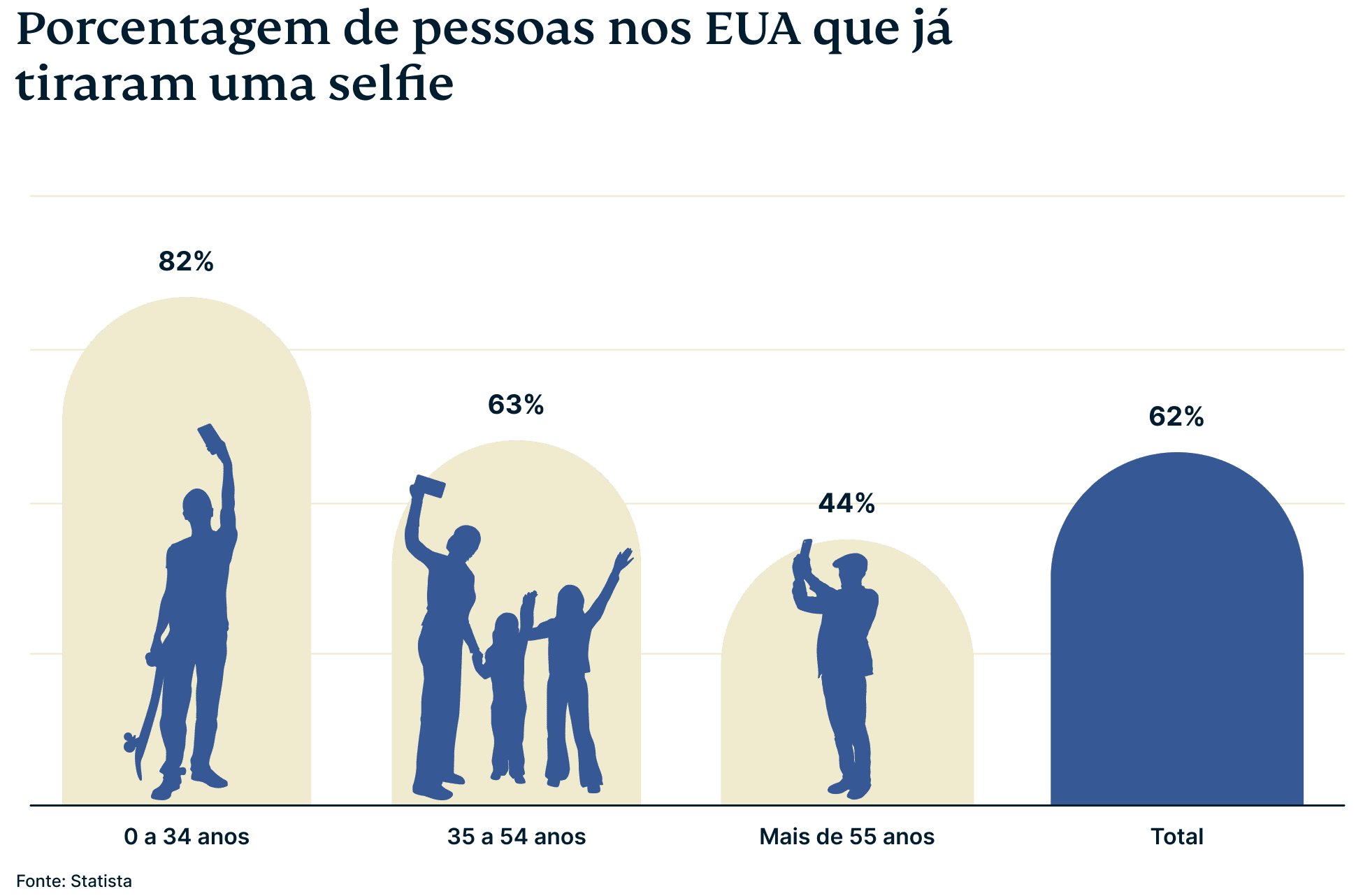 De fato, estatísticas de vários anos atrás revelaram que 62% das pessoas nos EUA fizeram uma selfie em algum momento de suas vidas. A faixa etária mais jovem, de 18 a 34 anos, foi a que mais tirou selfies, com 82% tendo feito uma.