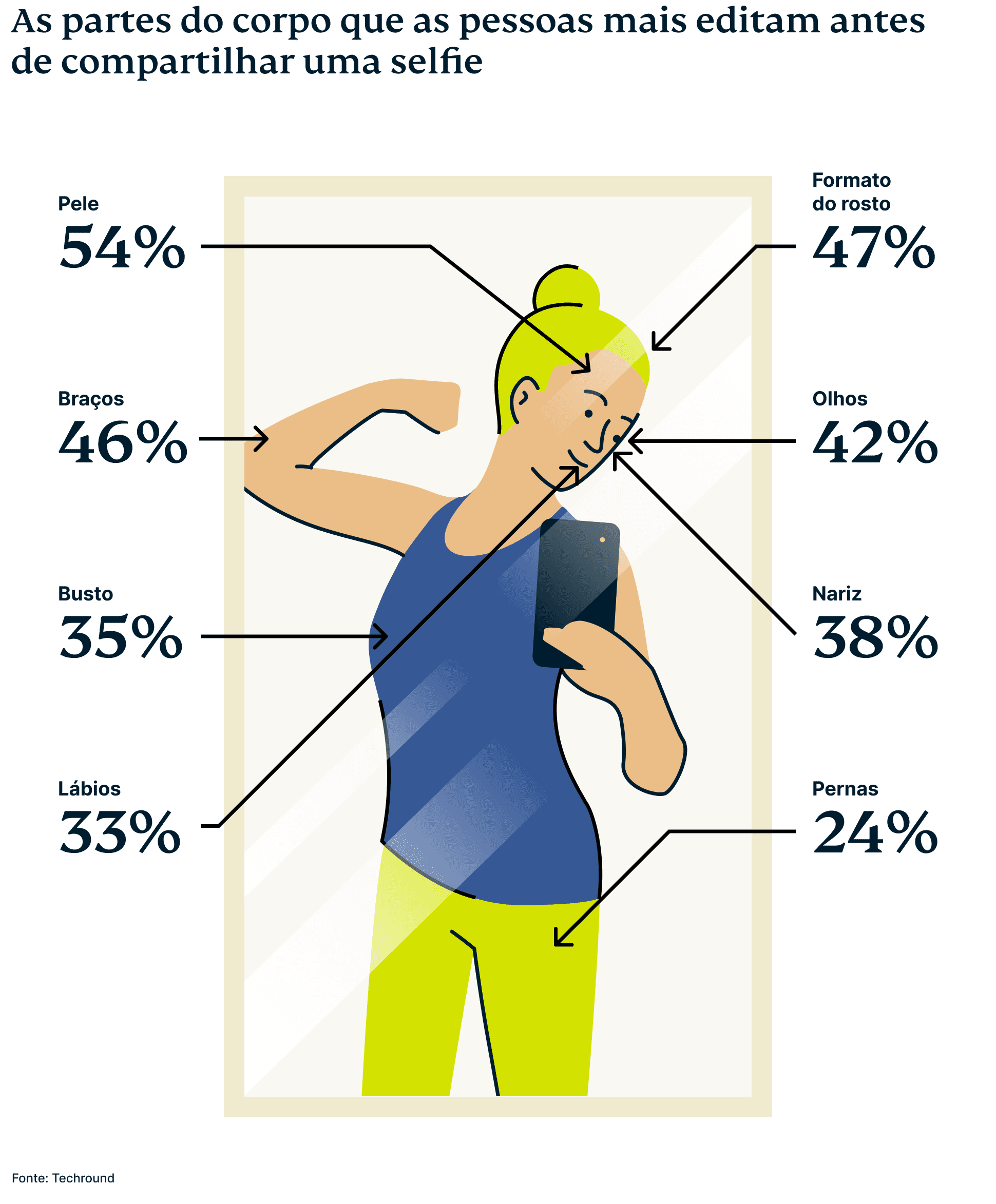 Das pessoas que editam suas selfies, cerca de 8% usam o Instagram para fazer isso, enquanto dois terços usam o aplicativo Facetune. Eles fazem isso para garantir que as imperfeições da pele sejam ocultadas e as características faciais sejam alteradas.