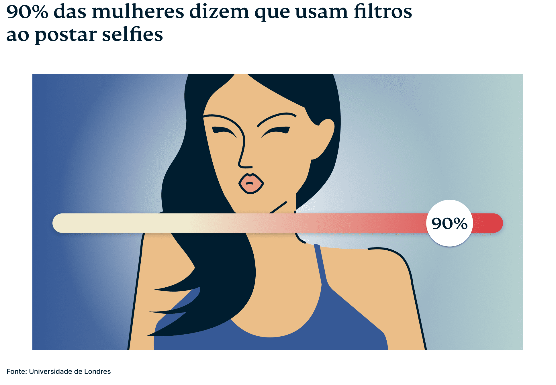 Os filtros também desempenham um papel significativo para moldar a aparência da pessoa no ambiente online. Tanto homens quanto mulheres admitiram usar filtros ocasionalmente para se mostrarem mais atraentes. No entanto, as mulheres são as usuárias mais frequentes, com 9 em cada 10 admitindo que utilizam filtros ao postar selfies nas redes sociais.