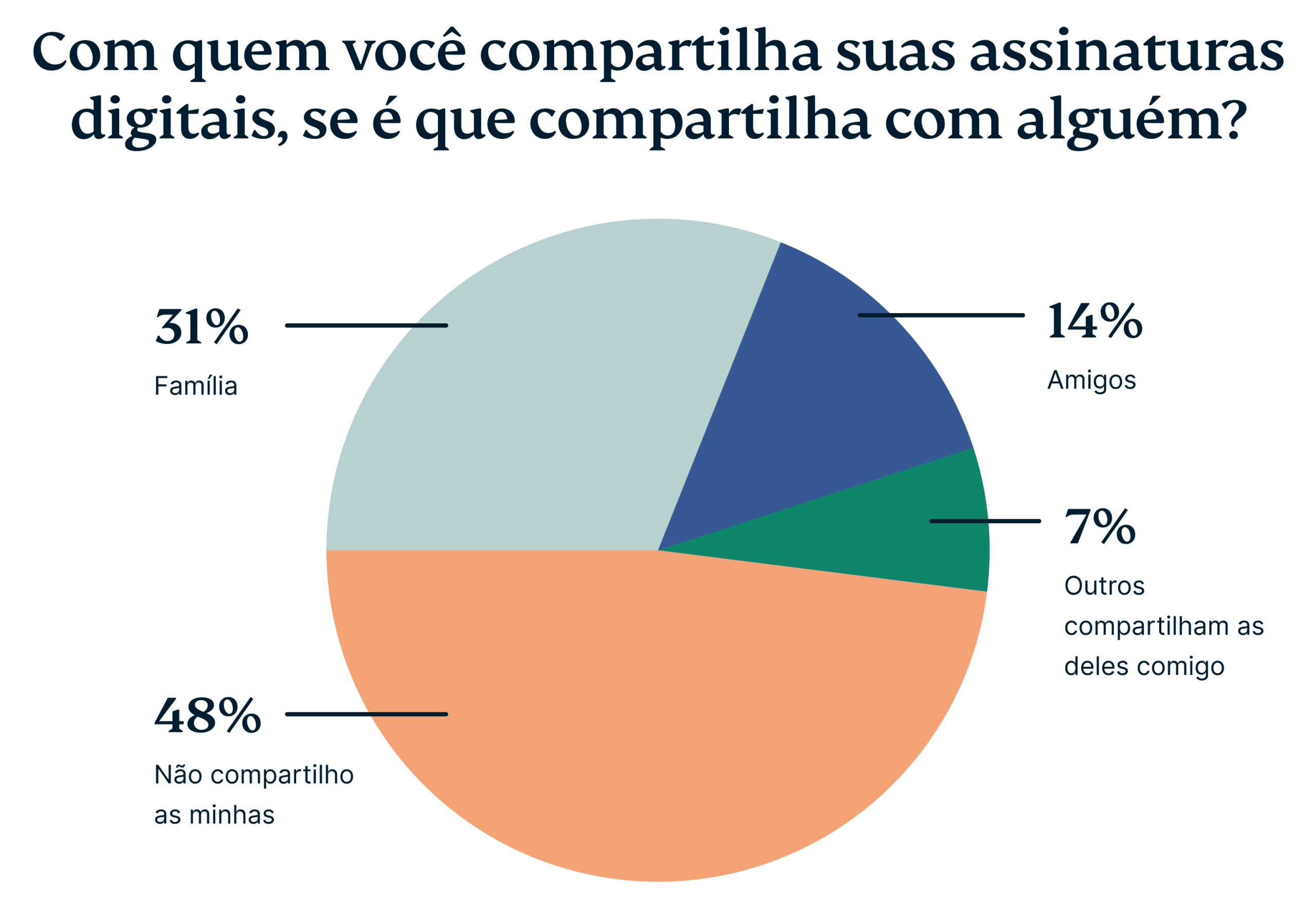 De acordo com nossa pesquisa, 31% das pessoas compartilham suas assinaturas digitais com membros da família, enquanto 14% estendem esse compartilhamento para amigos. Por outro lado, 7% dos entrevistados estão do outro lado, usando assinaturas pagas por outra pessoa. Isso significa que quase metade de todos os usuários está envolvida em alguma forma de compartilhamento de assinaturas.