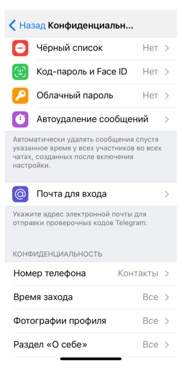 2. Нажмите на Конфиденциальность. Здесь вы можете выбрать, кто будет видеть ваш номер телефона, фото профиля и статус последнего посещения. Ограничьте доступ своими контактами, чтобы не показывать свои личные данные всем и общаться в TG более приватным образом.