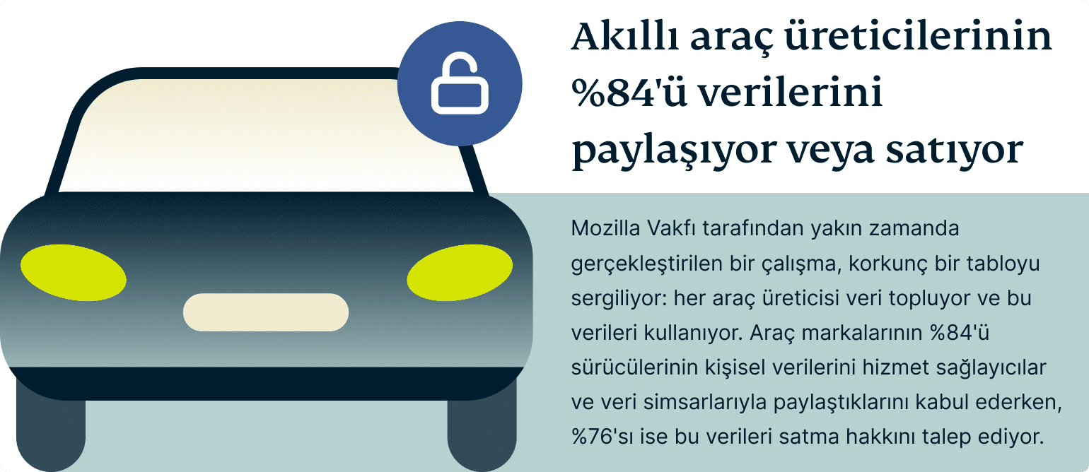 - Yakın zamanda gerçekleştirilen bir araştırma, neredeyse her otomobil üreticisinin sürücüler hakkında bilgi topladığını ve %84’ünün de bu verileri paylaştığını veya sattığını gösteriyor.