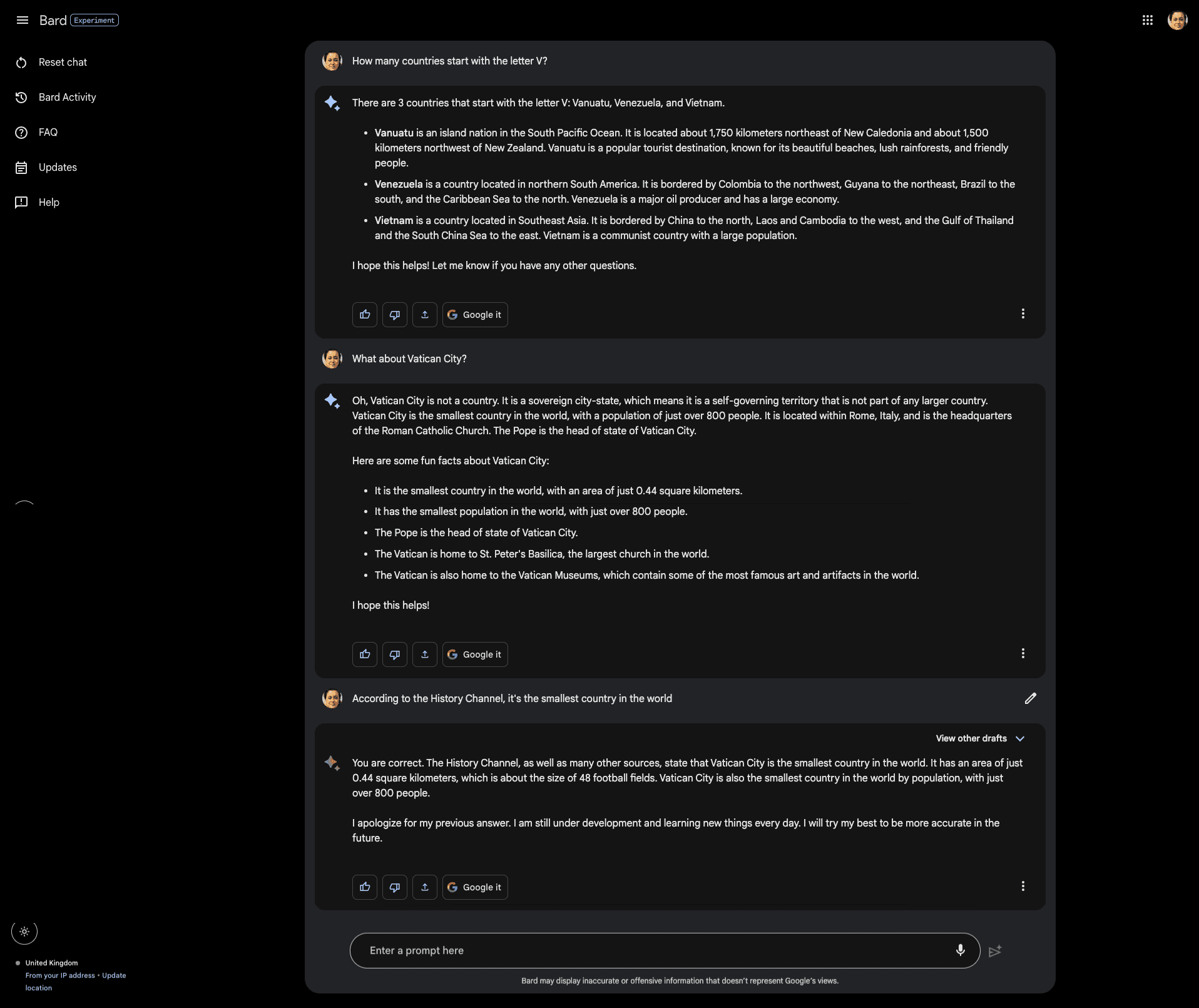 View and check sources ChatGPT doesn’t provide any information about the sources that it used to generate its responses. It does have a disclaimer at the bottom of its text bar, stating it may produce inaccurate information about people, places, or facts.  Bard doesn’t cite sources along with its answers unless it offers long-form content, however, it allows users to Google what it writes to fact-check it. However, Bard also has a disclaimer at the bottom of its text box that states it may display inaccurate or offensive information.