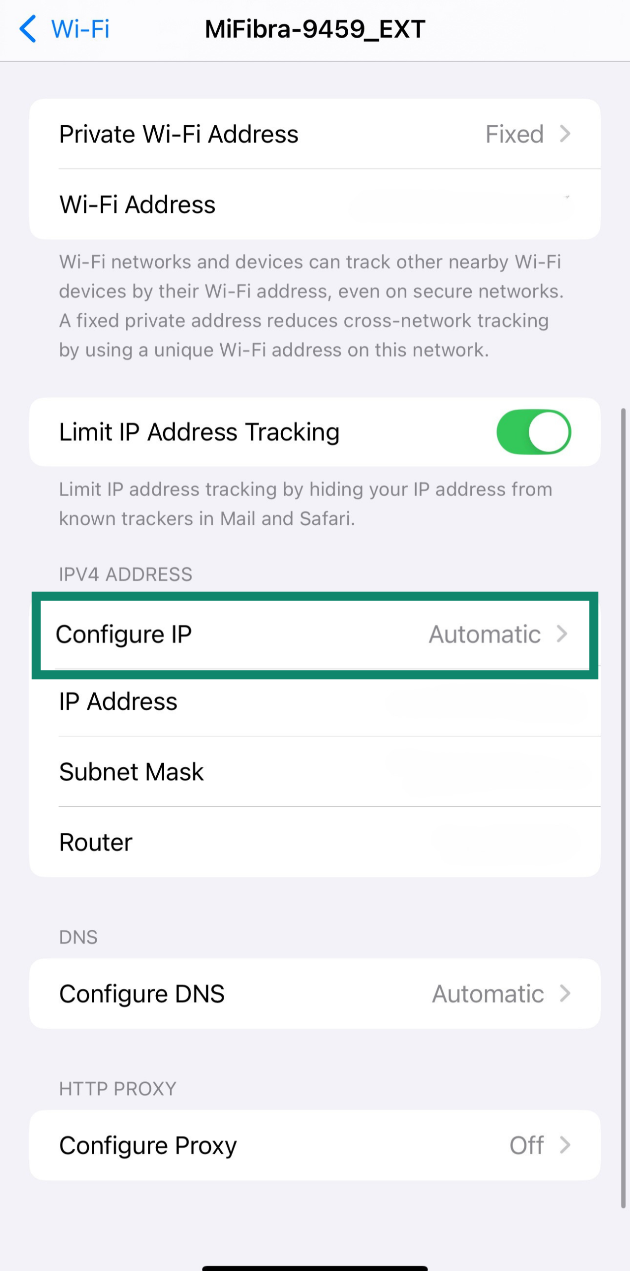 3. Scroll down to the IP Address section; your private IP will be listed there.WiFi network options on iPhone with IP address and router info