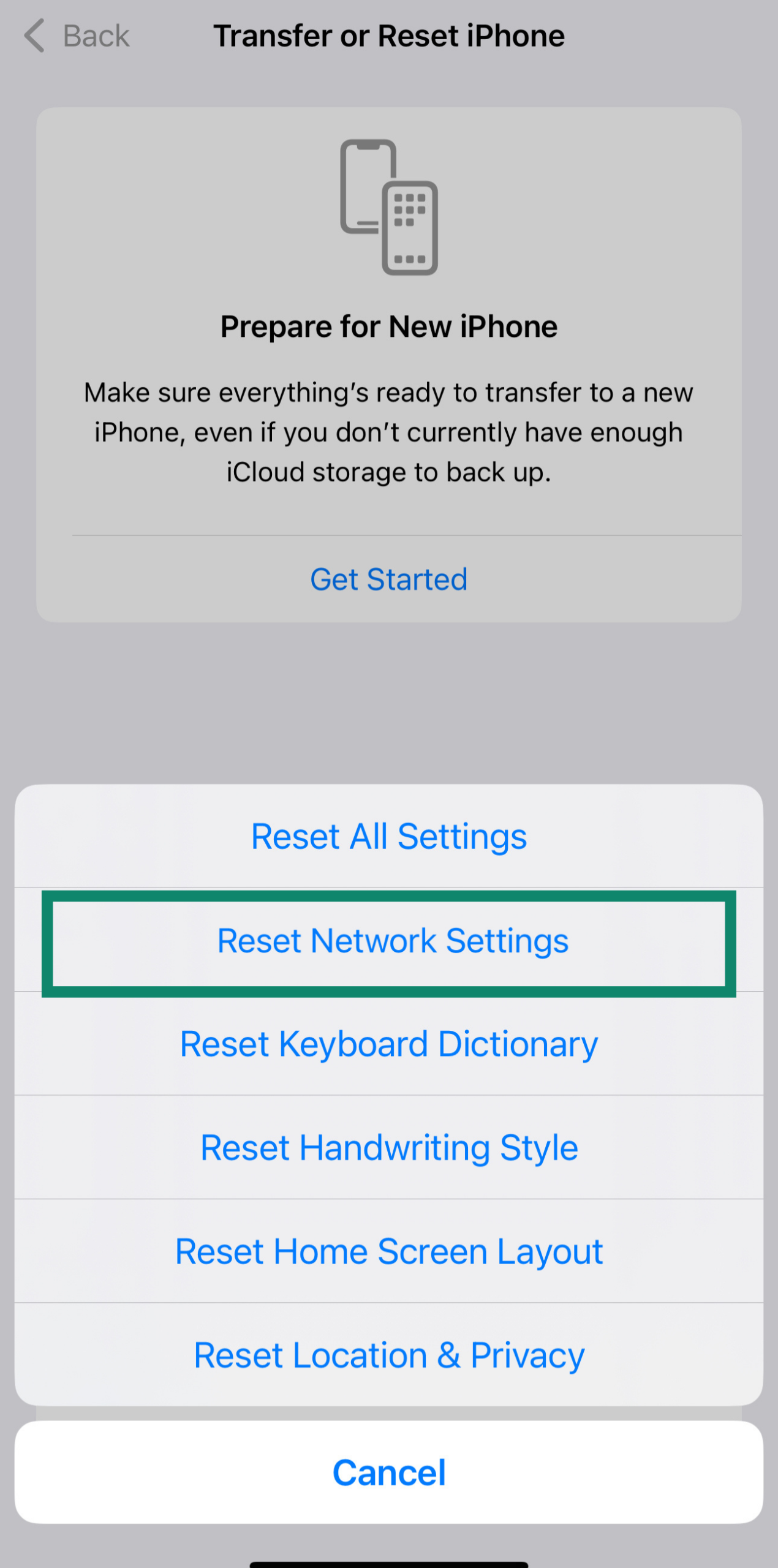 4. Choose Reset Network Settings. Your iPhone will restart, and your network settings will be cleared.