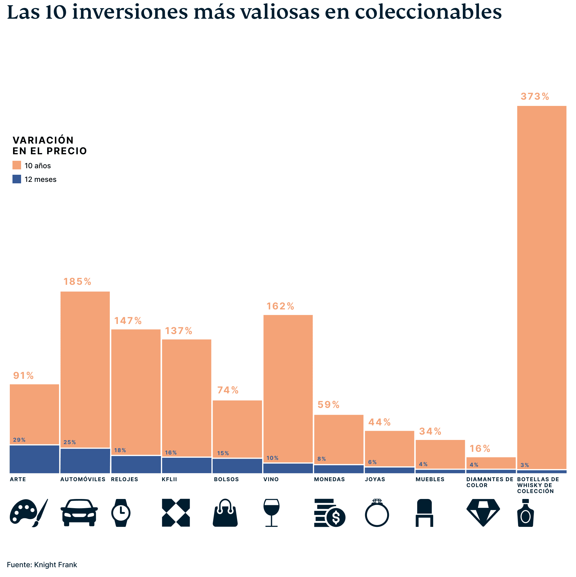 A la hora de evaluar las clases de inversiones en coleccionables, según el Knight Frank’s (KFLII) 2022 Wealth Report (en español, "Informe de riquezas de Knight Frank"), el whisky exótico es un líder claro, con una tasa de crecimiento del 373 % a 10 años. Cabe destacar que hay diversos factores que influyen en determinar el valor del whisky, incluyendo su edad, nivel de excepcionalidad y calidad en general.