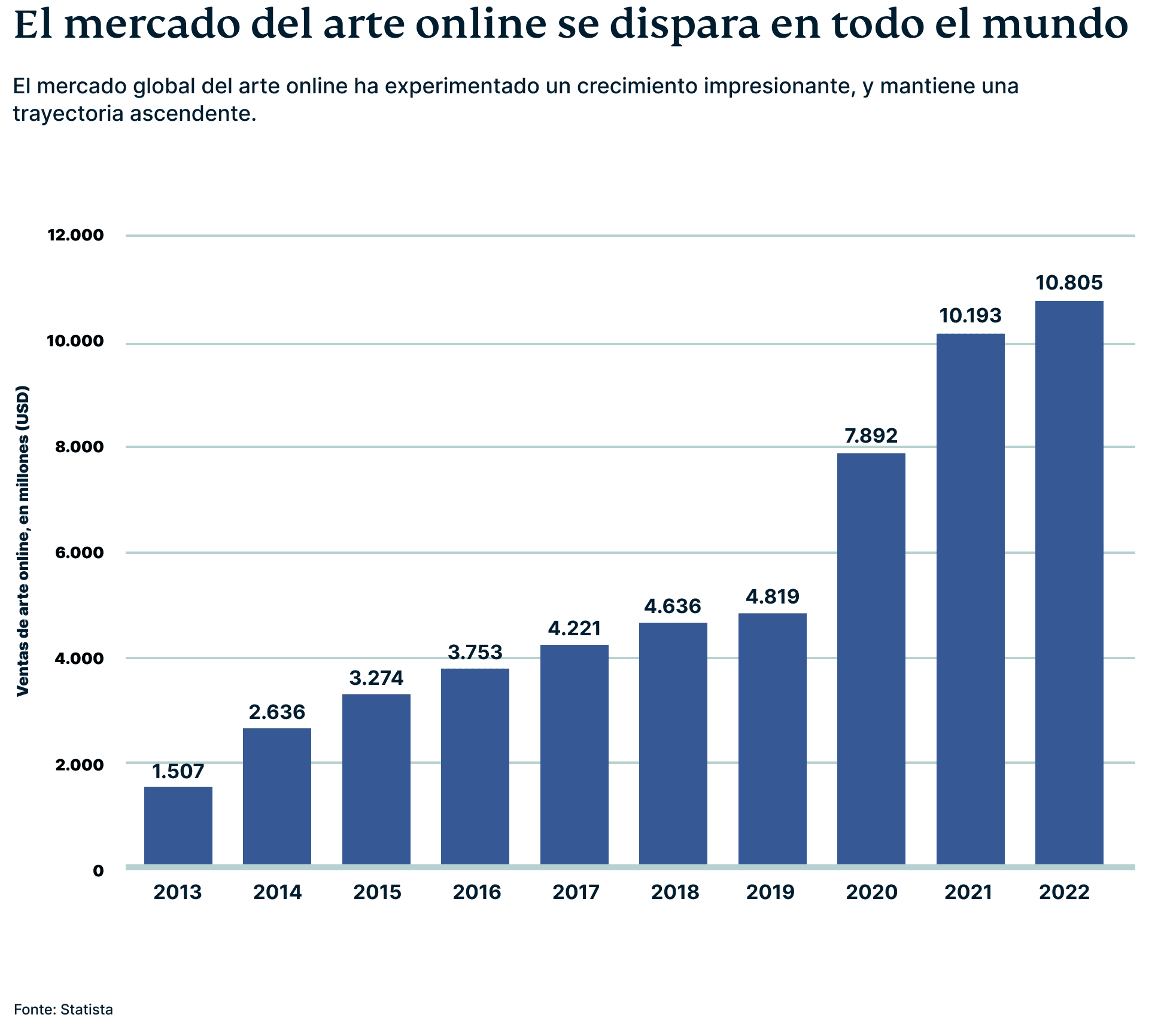 Una encuesta de 2022 realizada por Statista, reveló que el 74 % de los compradores de arte a nivel mundial usaron Instagram como plataforma para descubrir nuevas obras y artistas. Este hallazgo queda confirmado por Artsy, un mercado online de arte, en sus informes de tendencias en la industria del arte. Según la encuesta de Artsy, una cantidad significativa de galerías de arte identificaron Instagram como un canal clave para descubrir nuevos artistas, y las interacciones entre artistas jugaron un papel clave. El informe también reveló que las ventas online fueron fuentes de ingreso claves para sus galerías en 2022.