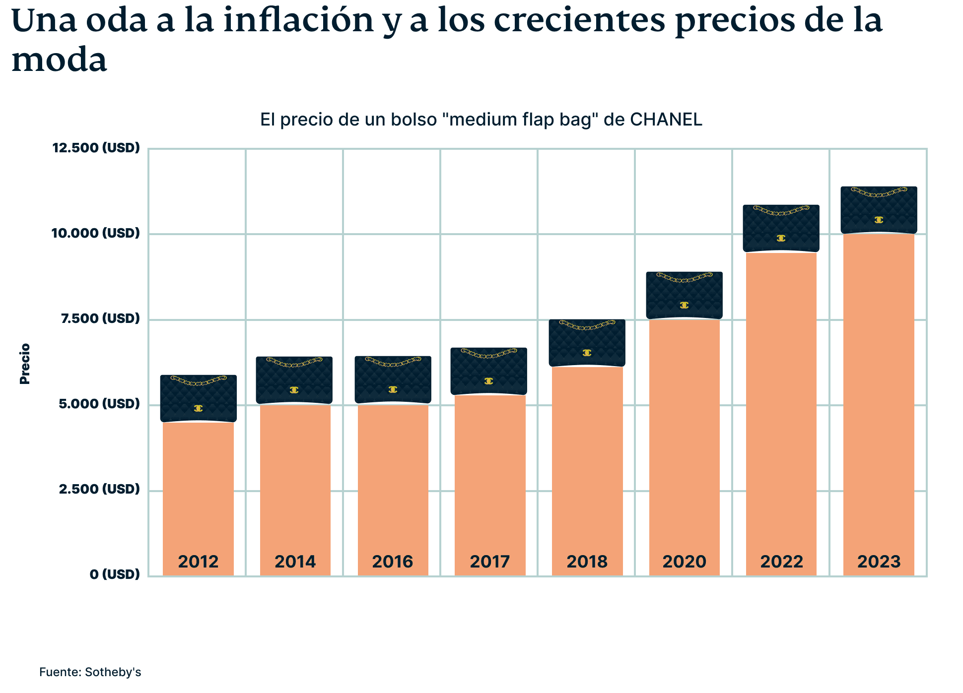 Los bolsos Chanel también han experimentado un notable incremento en sus precios con el tiempo, los más recientes en marzo de este año. Sotheby reporta que Chanel subió el precio de su bolso Medium Classic Flap en un 16 % (hoy en día cuesta más de 10.000 USD). Otros diseños populares, como el Coco Handle, el Chanel 19 y el Pearl Crush también han visto aumentos de precio en el orden del 14 %.