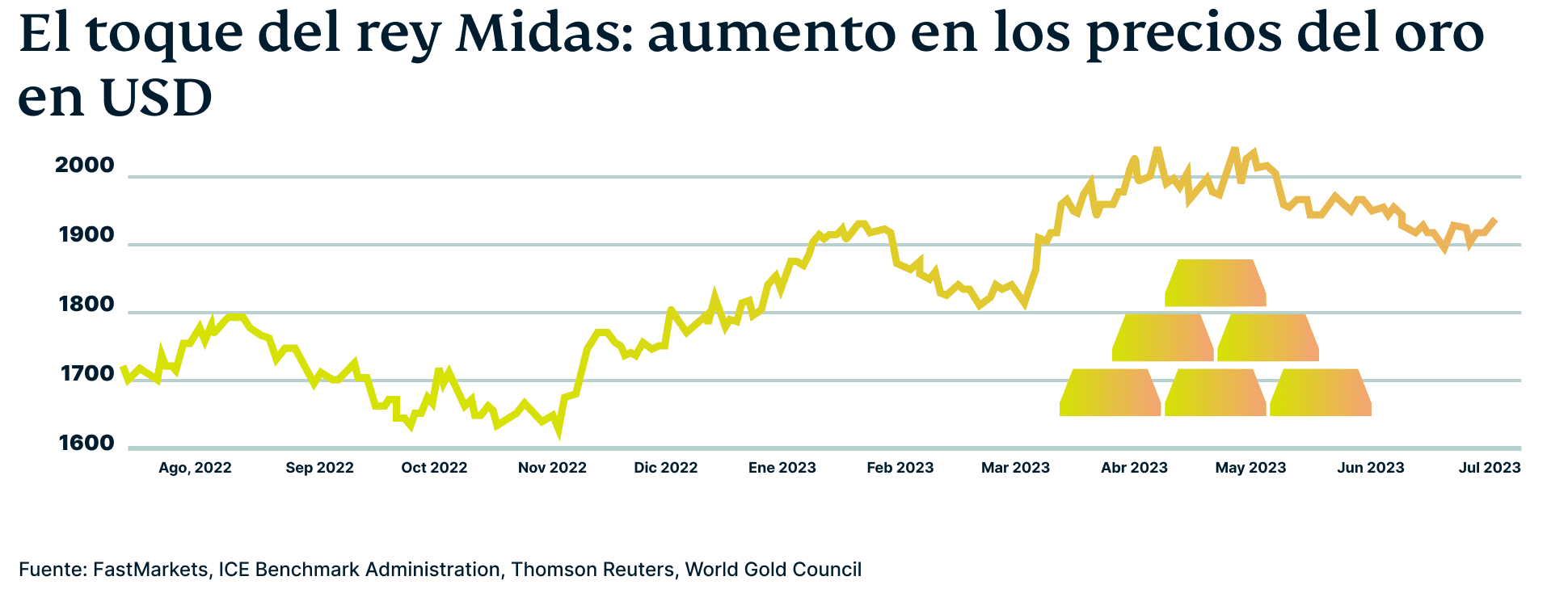Según informes de Barron's, una publicación financiera, el precio del oro sobrepasó los 2.000 USD por onza en abril de este año, lo que representan la segunda mayor avaluación de su historia. La publicación financiera resaltó que algunos factores, como el debilitamiento del dólar americano, el declive del rendimiento de los bonos y el potencial de ralentización económica han creado un nuevo foco de interés en el oro.