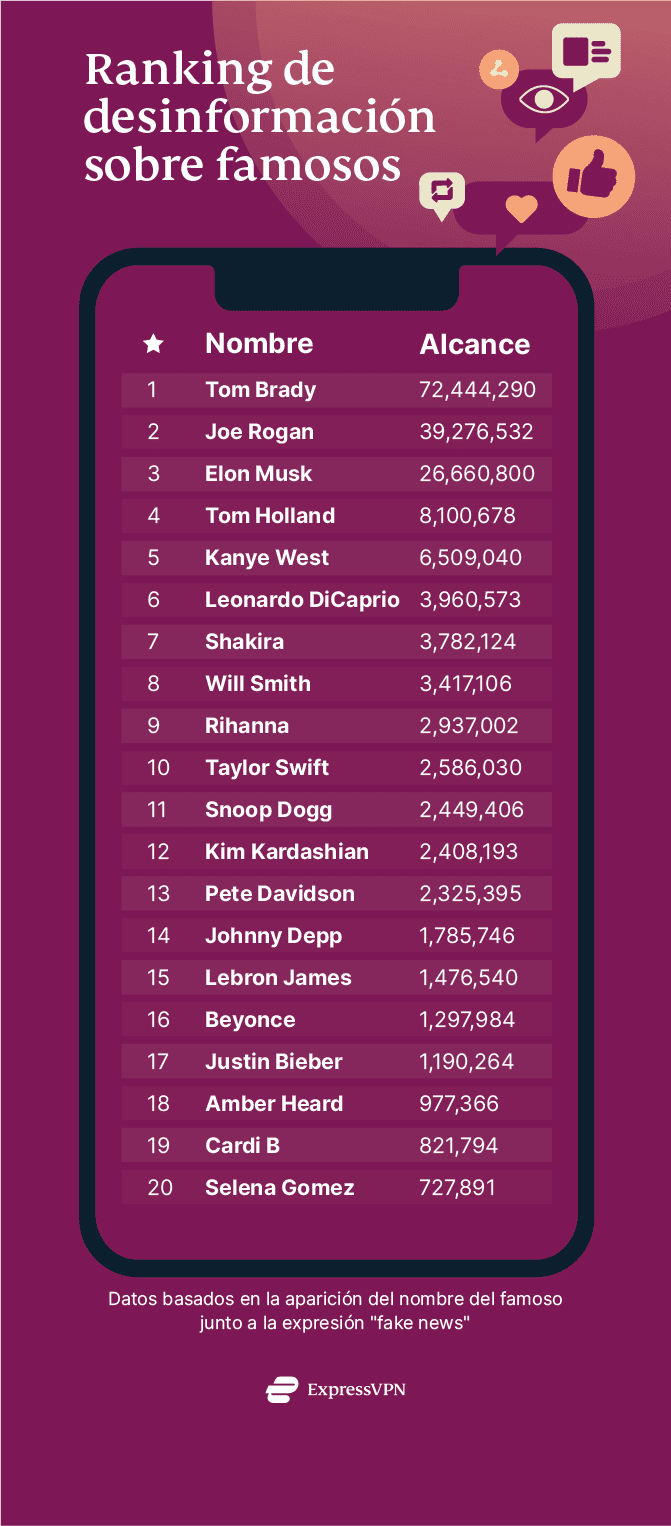 Primero identificamos los nombres de los famosos más buscados online, y después utilizamos datos de escucha de redes sociales para determinar con cuánta frecuencia se mencionaban sus nombres (en redes sociales, foros y comentarios) junto a la frase "noticias falsas", desde enero hasta octubre de 2022. A continuación, clasificamos a los famosos de acuerdo con diversos factores, como la cantidad de publicaciones, impresiones, alcance e interacciones.