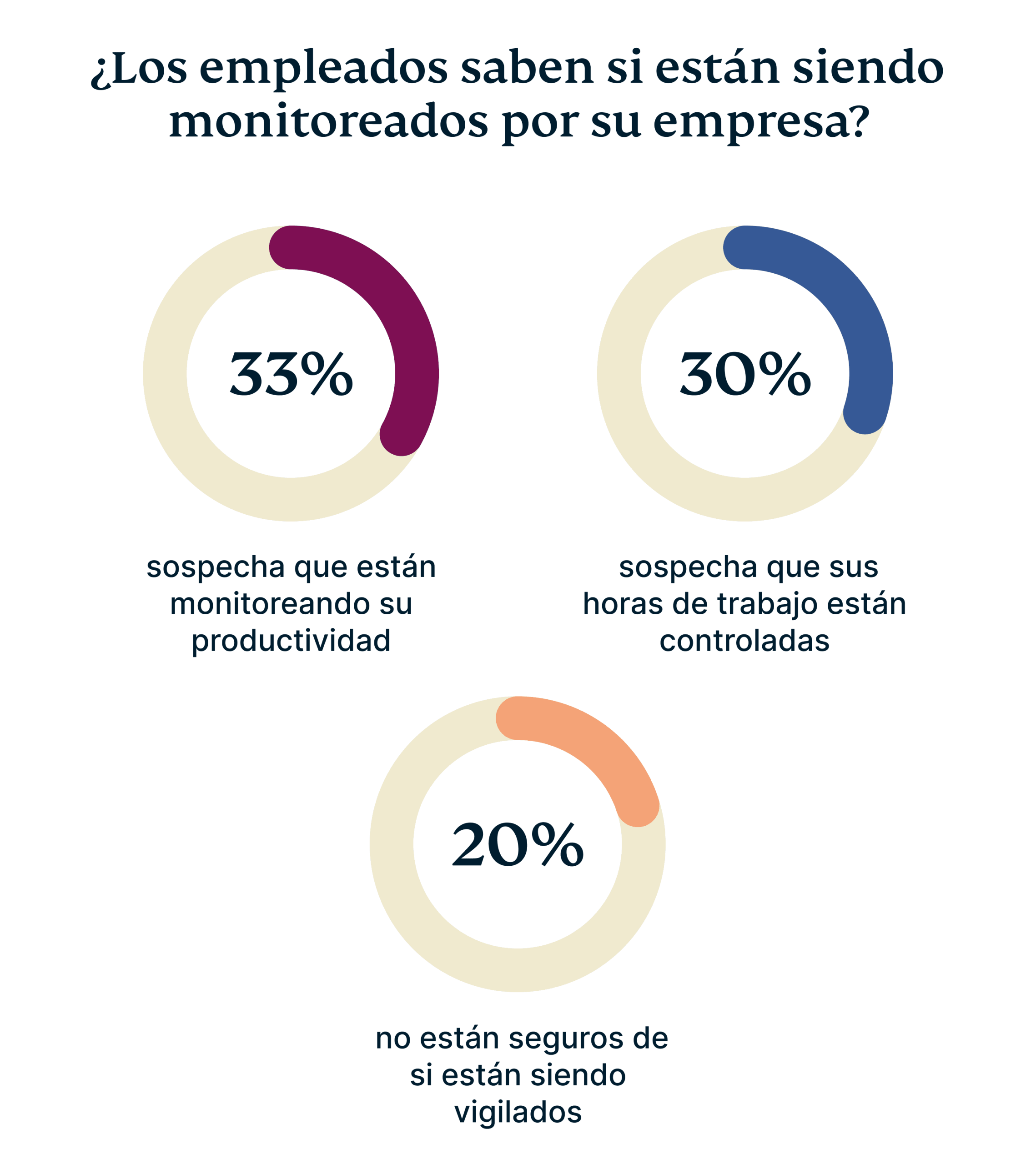 De nuevo, parece que estas medidas impactan en unos de los pilares fundamentales de la relación entre empresa y trabajador: la confianza. Cuando preguntamos a los encuestados españoles sobre la transparencia de sus empresas y su grado de conocimiento sobre las medidas que estas implementan para evaluar su actividad, un 33% respondió que sospecha que su empresa monitorea la productividad; un 30% sospecha que sus horas de trabajo están siendo monitoreadas y un 20% no está seguro de si les están controlando. Esta falta de transparencia e información real influye en la desconfianza y la desinformación respecto a los derechos del empleado y las obligaciones del empleador.