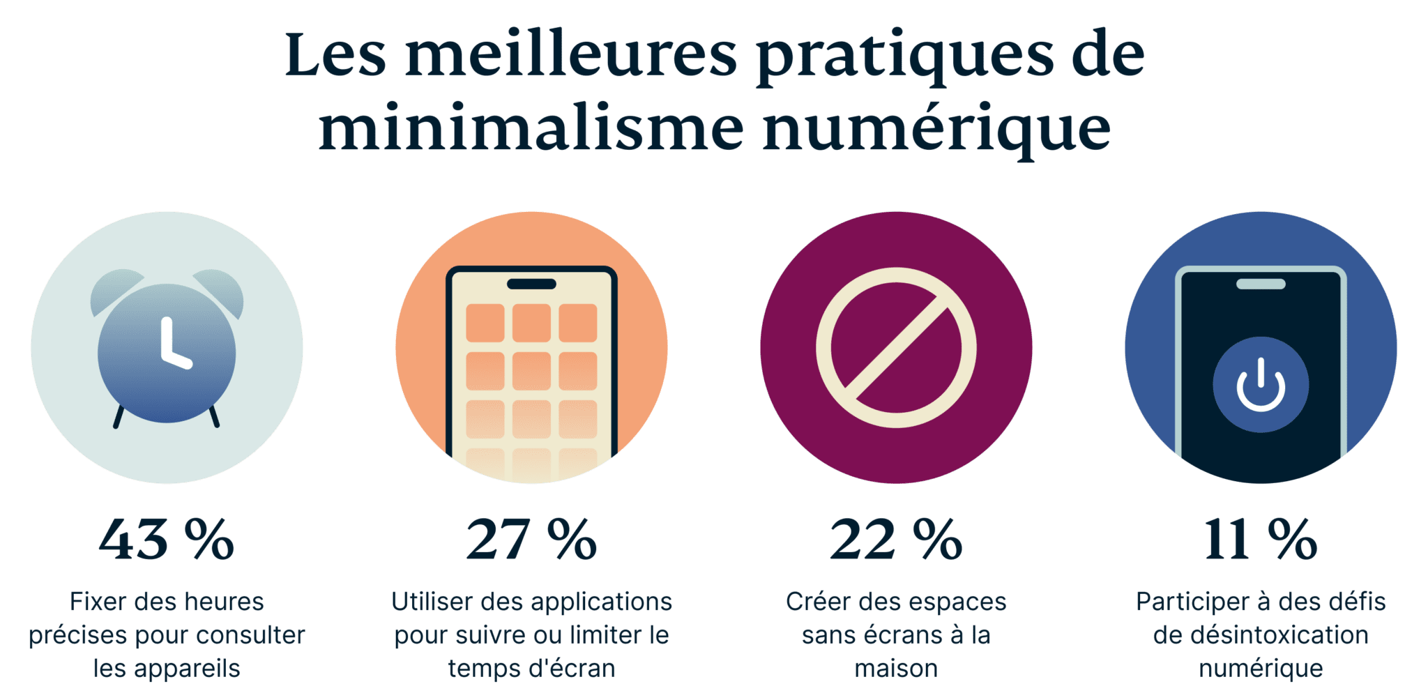 Les résultats obtenus sont surprenants ! Ils illustrent la façon dont les différentes générations aspirent – ou luttent – afin de parvenir à l'équilibre numérique. Ces données ne mettent pas seulement en évidence les différentes façons dont les internautes tentent d'adopter une approche plus réfléchie vis-à-vis des nouvelles technologies, mais offrent également des conseils pour promouvoir le minimalisme numérique.