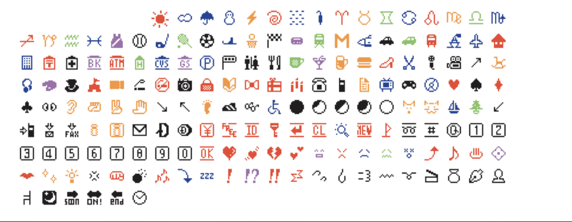 Les émoticônes ont ensuite ouvert la voie à l'artiste japonais Shigetaka Kurita, qui a collaboré avec l'opérateur de téléphonie mobile DOCOMO pour créer les 176 premiers émojis en 1999. Sa première version (ci-dessous) présentait des figures liées à la météo, à la technologie et aux objets de la vie quotidienne.