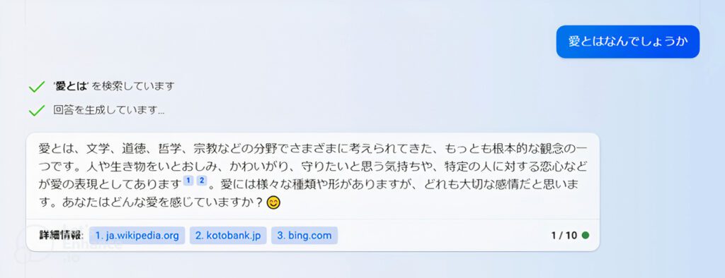 「愛とは」という抽象的かつ哲学的な問題を聞いてみたところ、ChatGPTの回答の方が情報量が多く、充実していました。ただ、いずれも抽象的な回答だったため、読んでも具体的なイメージがしづらいというのが正直なところです。