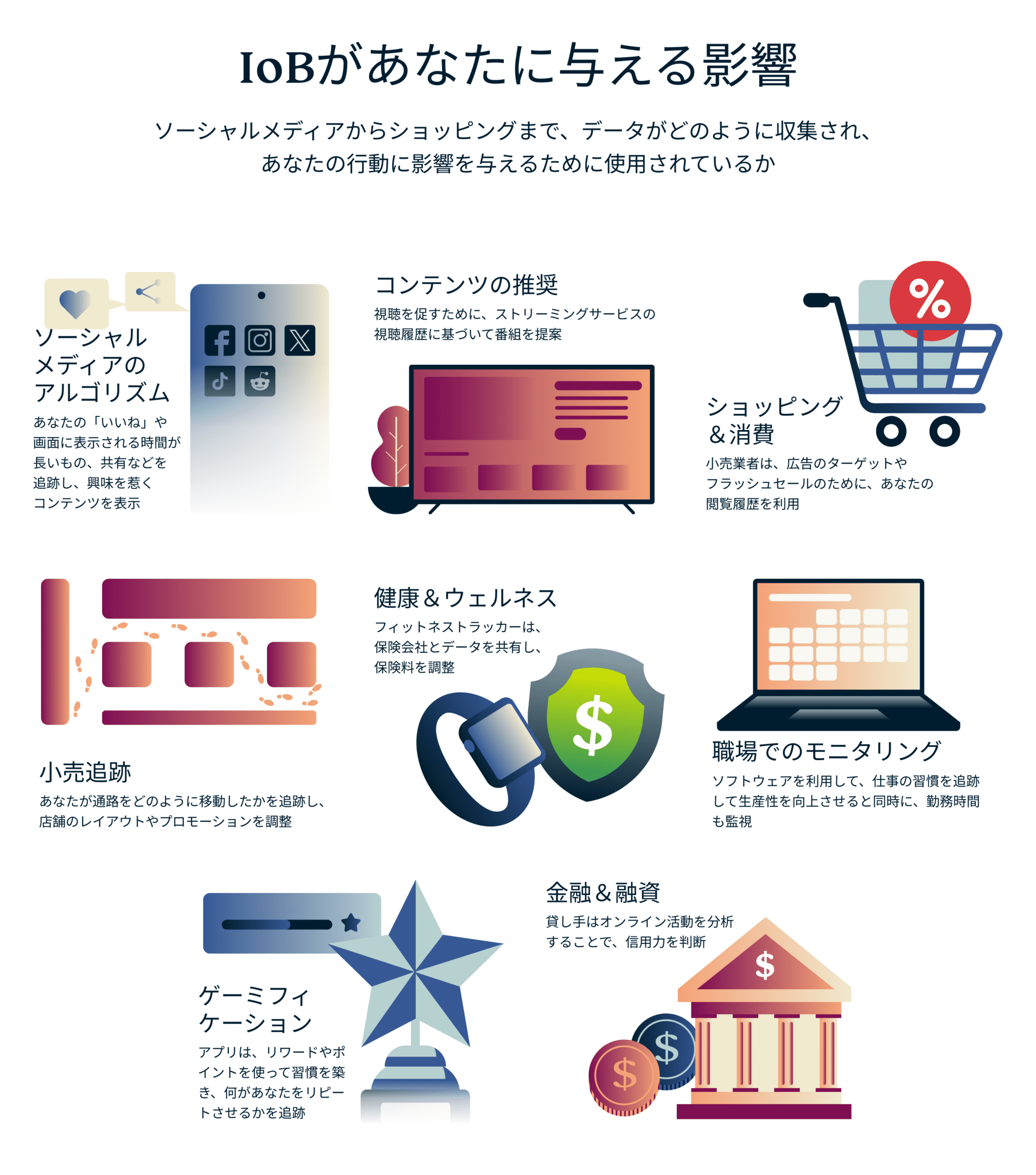 また、IoBはデータに依存しています。あなたが見た動画、クリックした製品、あるいは特定の投稿にどれだけの時間を費やしたかなど、すべてのオンラインでのやり取りが、詳細な行動プロファイルに反映されます。このプロファイルは企業によって、あなたの習慣、嗜好、そして将来の行動を理解するために利用されます。言い換えれば、あなたのすべてのクリック、スクロール、タップが、ブランドや広告主、さらには政府があなたにどのように対応するかを形作るデータポイントになるのです。