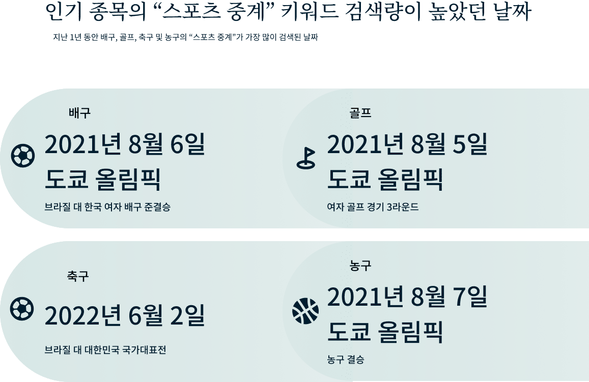 축구뿐 아니라 다른 인기 스포츠도 사람들의 관심도가 높아졌습니다. 다음은 지난 1년간 (2021-2022) 각 스포츠 경기 중계에 대해 사람들의 관심도가 가장 높았던 날짜입니다.