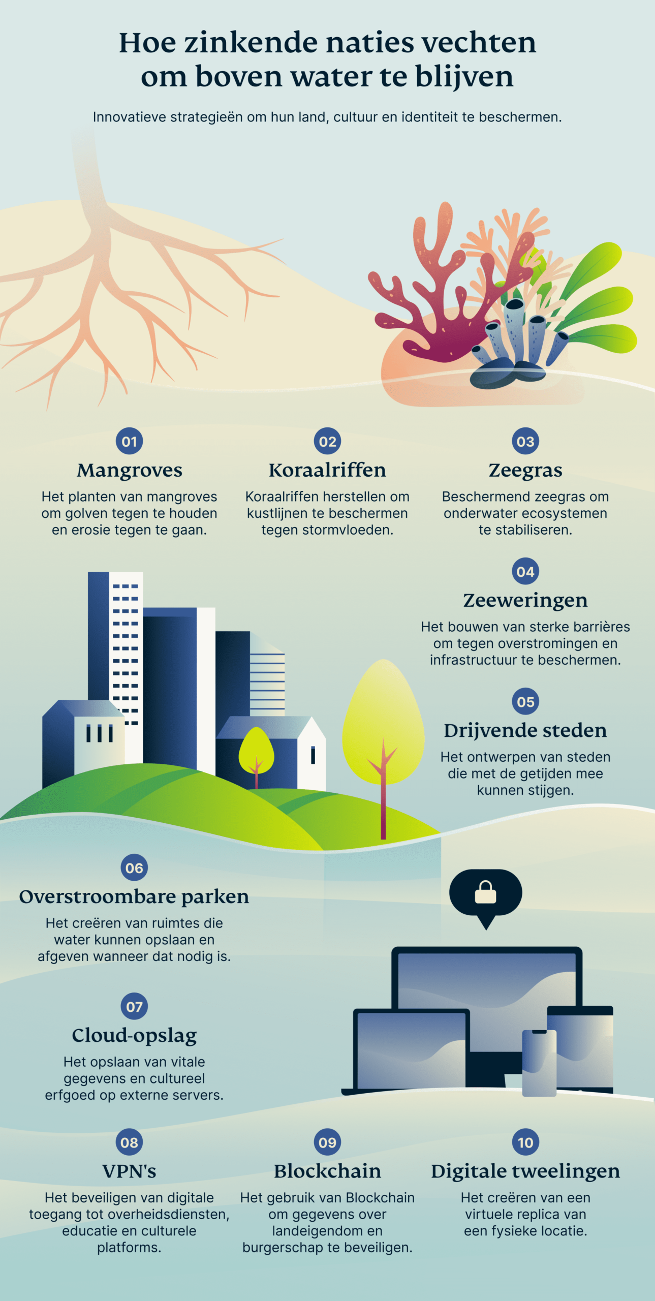 Wanneer de natuur alleen de stijgende zeeën niet kan tegenhouden, wenden landen zich tot techniek. Zeeweringen, dijken en dammen worden gebouwd in kwetsbare regio’s om een eerste verdedigingslinie te vormen tegen oprukkend water. In Tuvalu zijn versterkte zeeweringen gebouwd rond de meest kritieke gebieden, waardoor niet alleen huizen, maar ook essentiële infrastructuur zoals ziekenhuizen en overheidsgebouwen worden beschermd.